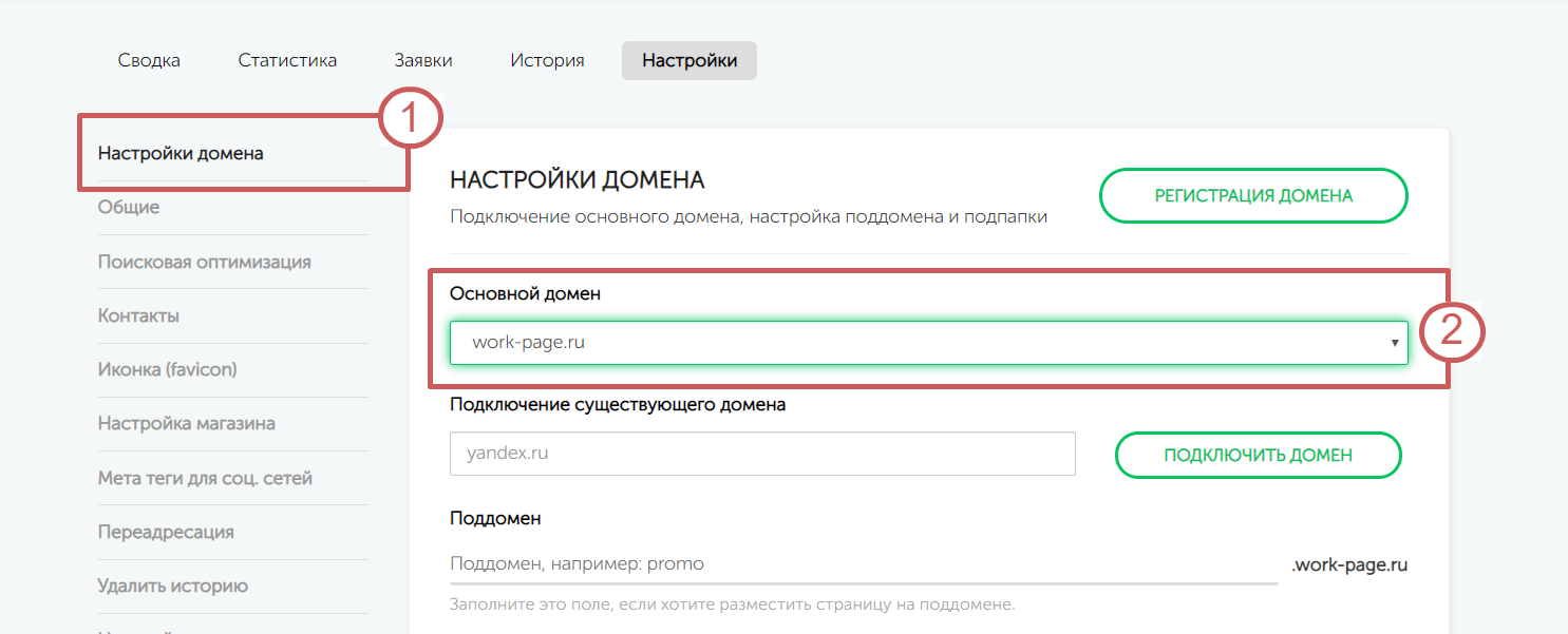 1. Перейдите в настройки страницы, в раздел "Настройки домена ".