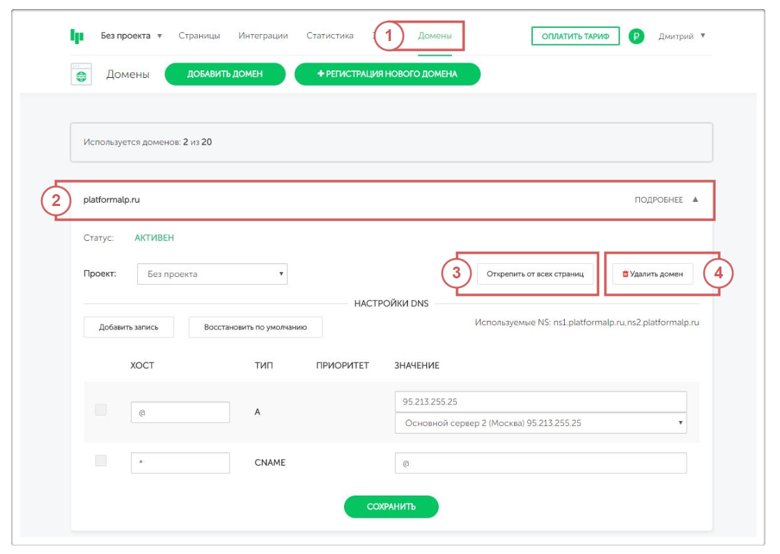Нажимаем кнопку “Открепить от всех страниц ” и “Удалить домен “.