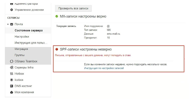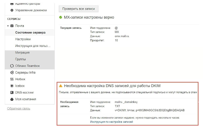 Проверить записи можно в кабинете сервиса**biz.mail.ru,** в разделе «Почта », во вкладке «Состояние сервера ».