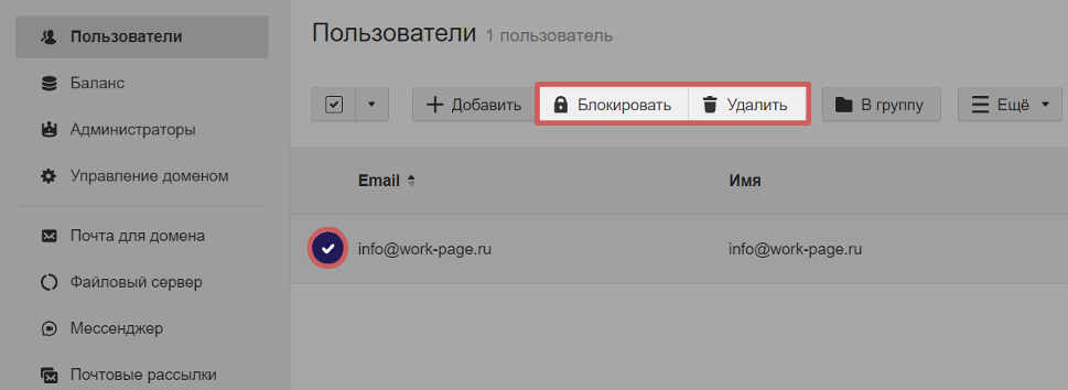 Блокировка пользователя -**** отключает пользователю доступ к почте и другим сервисам. Но, вся информация, которая хранится в почтовом ящике, сохранится. В дальнейшем, пользователя можно разблокировать.