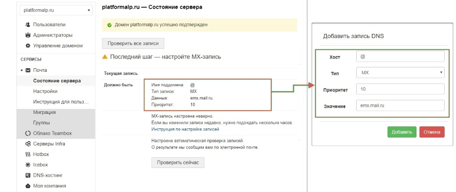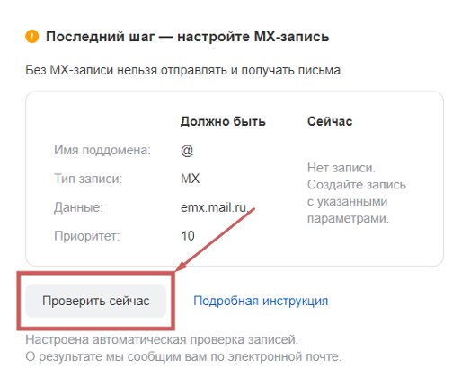 После добавления необходимо подтвердить наличие MX-записи, нажав на кнопку «Проверить сейчас »: