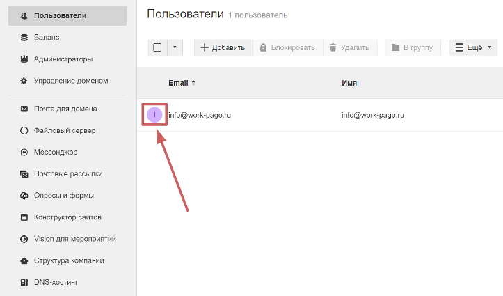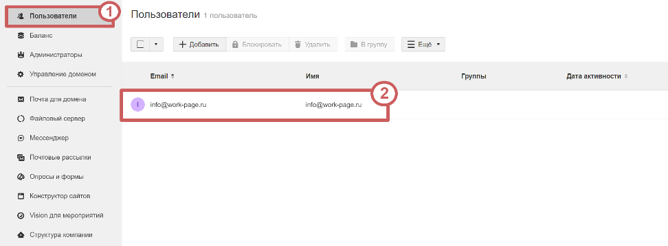 Шаг 3. Готово, мы добавили пользователя и тем самым создали электронный адрес info@work-page.ru.**** Список пользователей мы может увидеть в панели администратора, в разделе «Пользователи »: