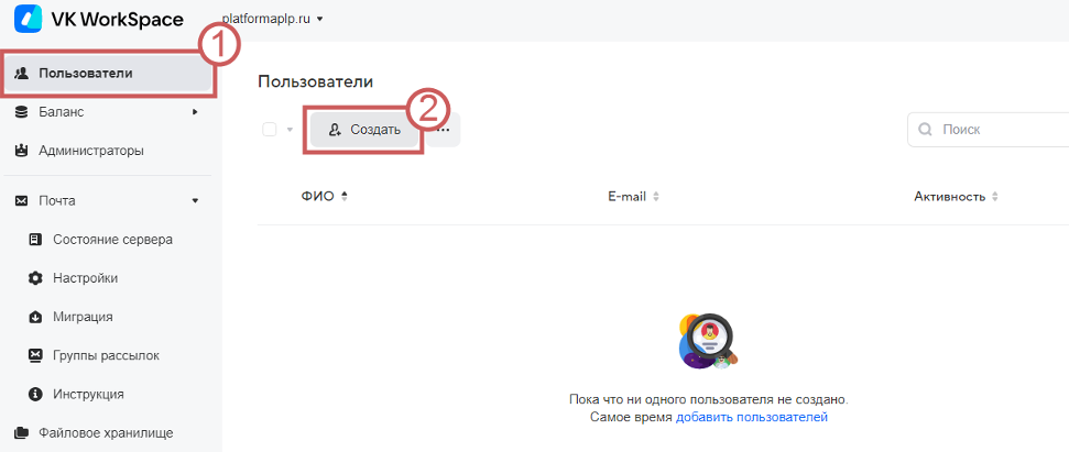Шаг 1. Заходим в личный кабинет biz.mail.ru, в раздел «Пользователи » и нажимаем на кнопку «Добавить »: