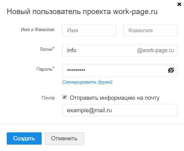 Логин. В этом поле мы указываем желаемый электронный адрес, который хотим создать. Обратите внимание, что в этом поле не нужно указывать сам домен. Например, если вы добавили на biz mail домен work-page.ru и хотите сделать адрес **info@work-page.ru **- достаточно в поле логина написать info.