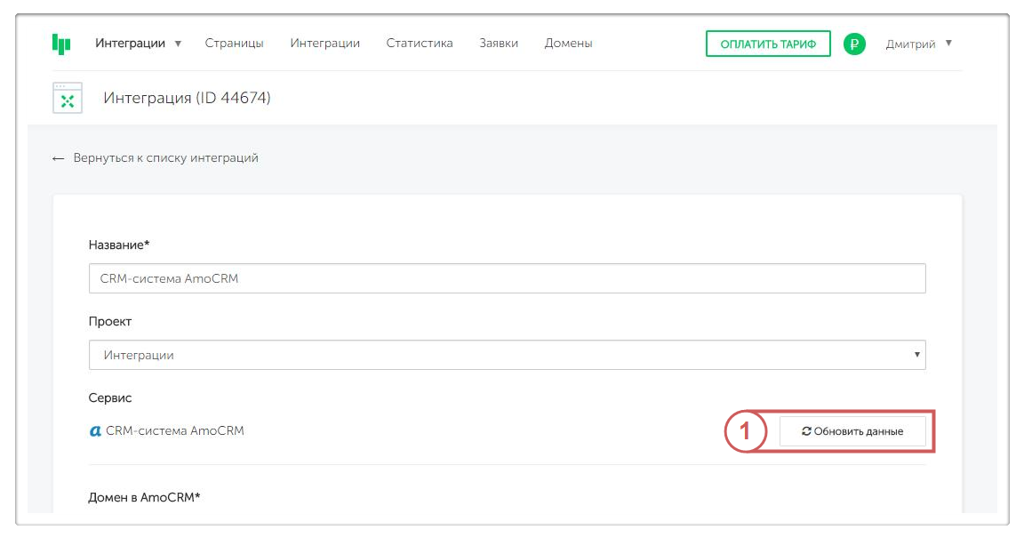 📌Важно: Если не подгружаются данные из AmoCrm в выпадающие списки после авторизации, то нажимаем кнопку «Обновить данные » в интеграции Платформы LP.