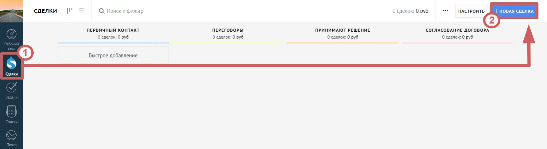 Шаг 1. Перейдите в личный кабинет AmoCRM, в раздел «Сделки » и нажмите на кнопку «Новая сделка »