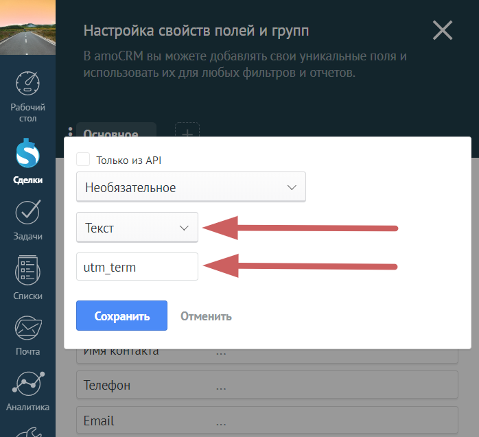 Далее выберите тип поля (в данном случае, для utm метки нам подойдет тип поля «Текст ») и укажите название поля. Название будет отображаться в настройках интеграции, где вы будете его выбирать.