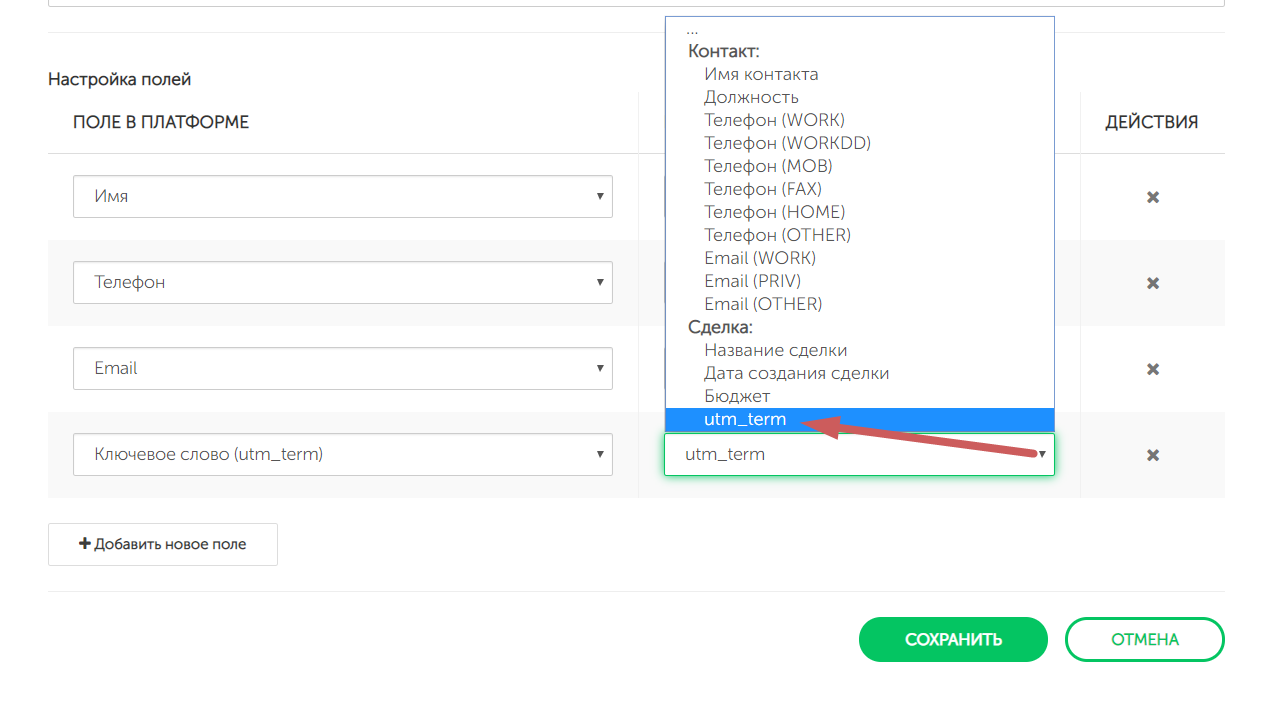 Готово! Теперь мы можем выбрать созданное нами поле, чтобы передавать в него utm метку: