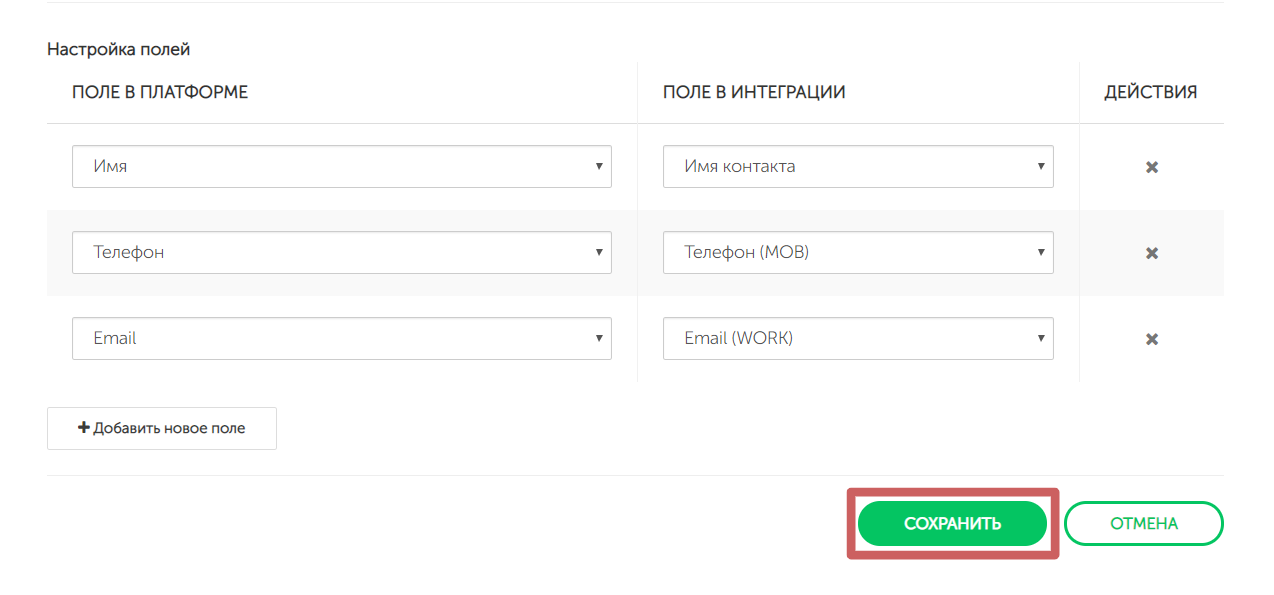 Сохраняем настройки интеграции, после выполнения всех настроек.