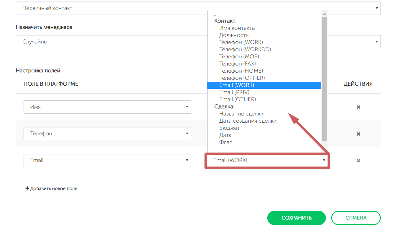 После выполнения настроек выше, переходим к настройкам полей. В этих настройках мы указываем, какие поля с форм будут передаваться в АМО.