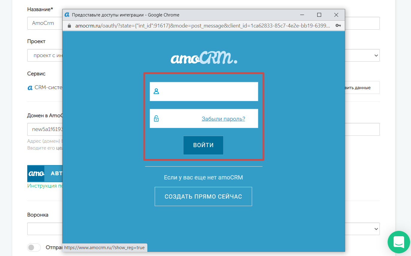4. Во всплывшем отдельном окне авторизуемся в аккаунте AmoCrm или нажимаем на «Создать прямо сейчас» для регистрации на сервисе.