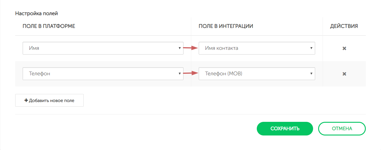 Слева выбираем поля с формы, справа выбираем поле с личного кабинета АМО, в которое будет передаваться информация.