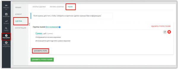 Шаг 1. Переходим в “Настройки ” в раздел “Сделка ” во вкладку “Поля ”.