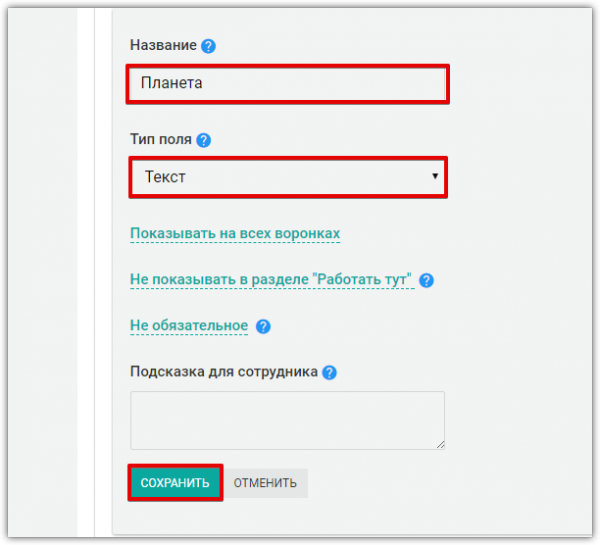 Шаг 2. Указываем “Название поля ”, его “Тип ” и нажимаем “Сохранить ”