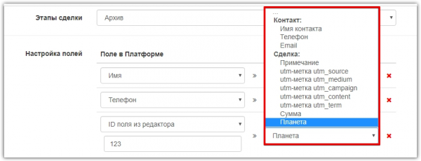 После обновления поле появится в выпадающем списке “Поле в интеграции ”