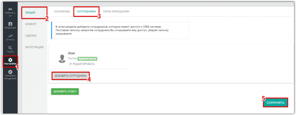 Шаг 1. **** Переходим в “Настройки ” в раздел “Общие ” во вкладку “Сотрудники ”.