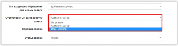 После обновления сотрудник появится в выпадающем списке “Ответственный за обработку заявок ”