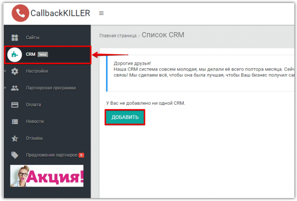 Шаг 2. После регистрации переходим в раздел “CRM ” и добавляем новую CRM