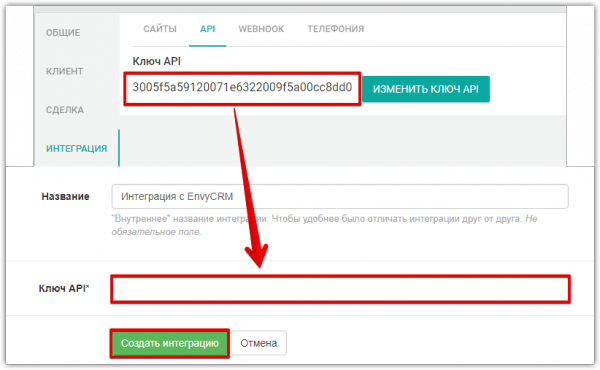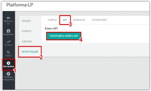 Шаг 5. Переходим в “Настройки ” в раздел “Интеграции ” во вкладку “API ” и “Получаем Ключ API ”