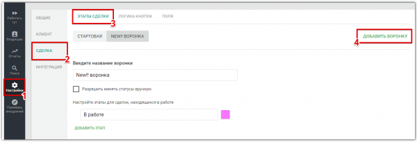 Шаг 1. Переходим в “Настройки ” в раздел “Сделка ” во вкладку “Этапы сделки ” и добавляем “Воронку ”.