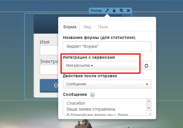 2. В редакторе, в настройках формы, выберите созданную вами интеграцию: