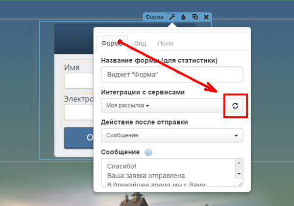 Если созданная интеграция не появилась в настройках формы – обновите данные: