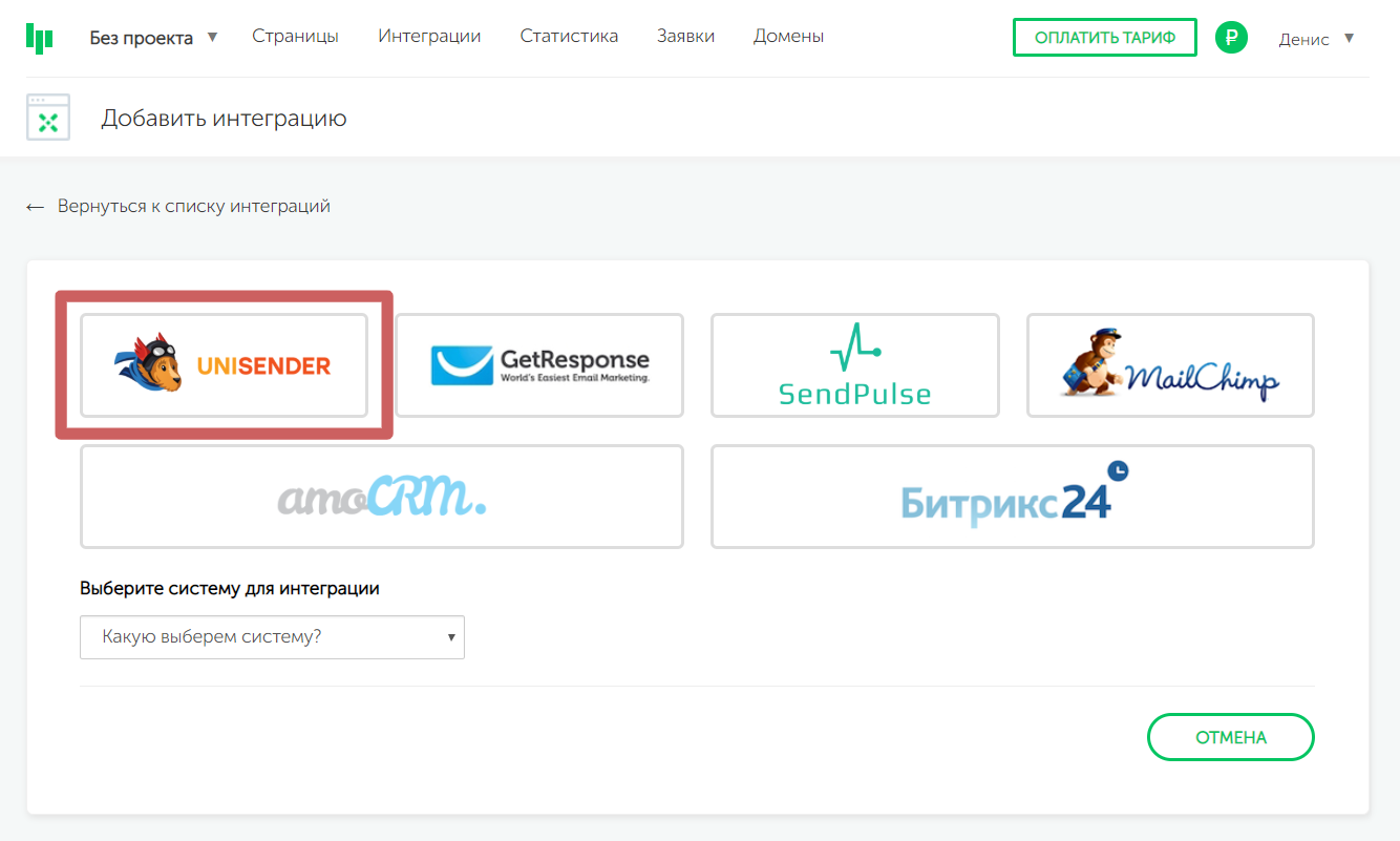 И при добавлении интеграции выберите «UniSende r»