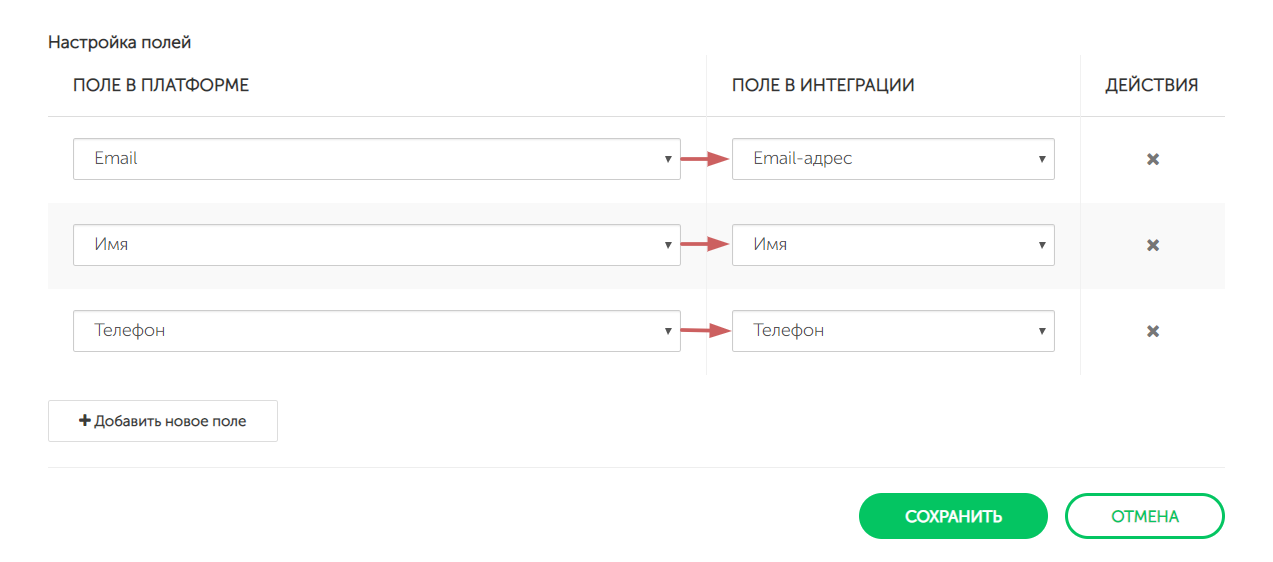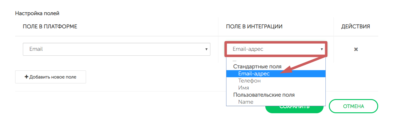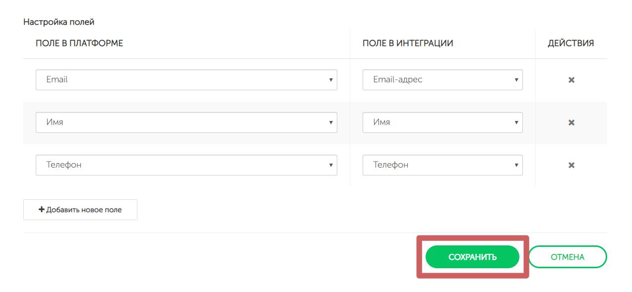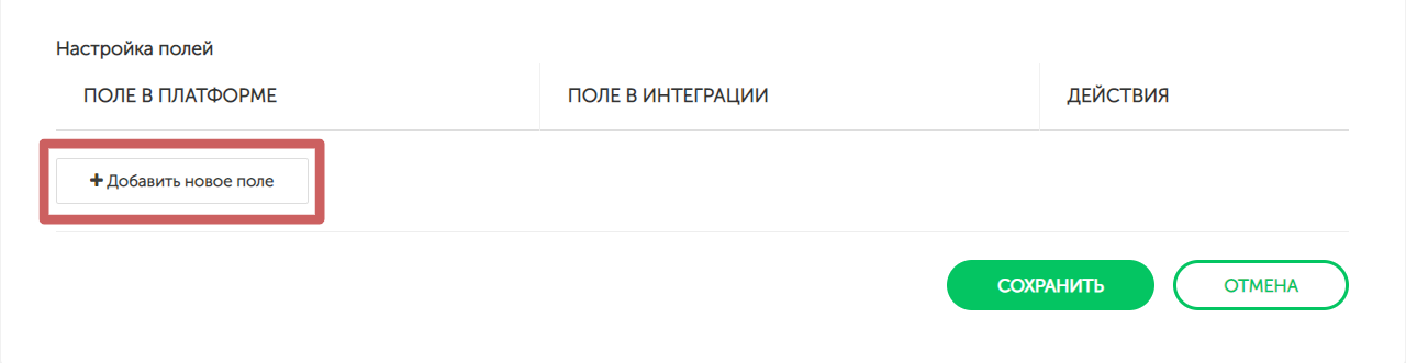 Изначально в настройках интеграции не будет добавлено ни одного поля. Нажимаем на кнопку «Добавить новое поле »
