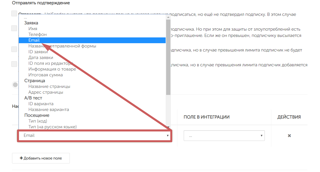 После добавления - нажимаем на поле слева и выбираем, какое именно поле хотим передать. Например, если мы хотим передать email нашего клиента, который он укажет в форме - выбираем поле «Email »: