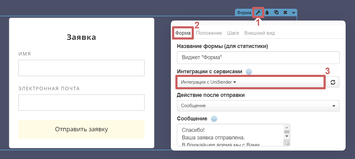 После создания интеграции, необходимо подключить ее к формам, с которых хотим передавать заявки в UniSender.