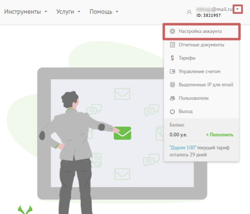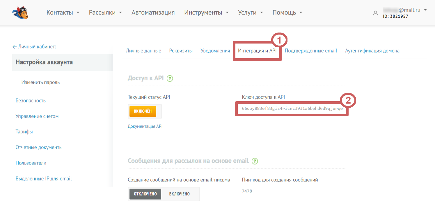 2. Ключ API. Скопировать его можно в личном кабинете UniSender. Для этого зайдите в настройки вашего аккаунта: