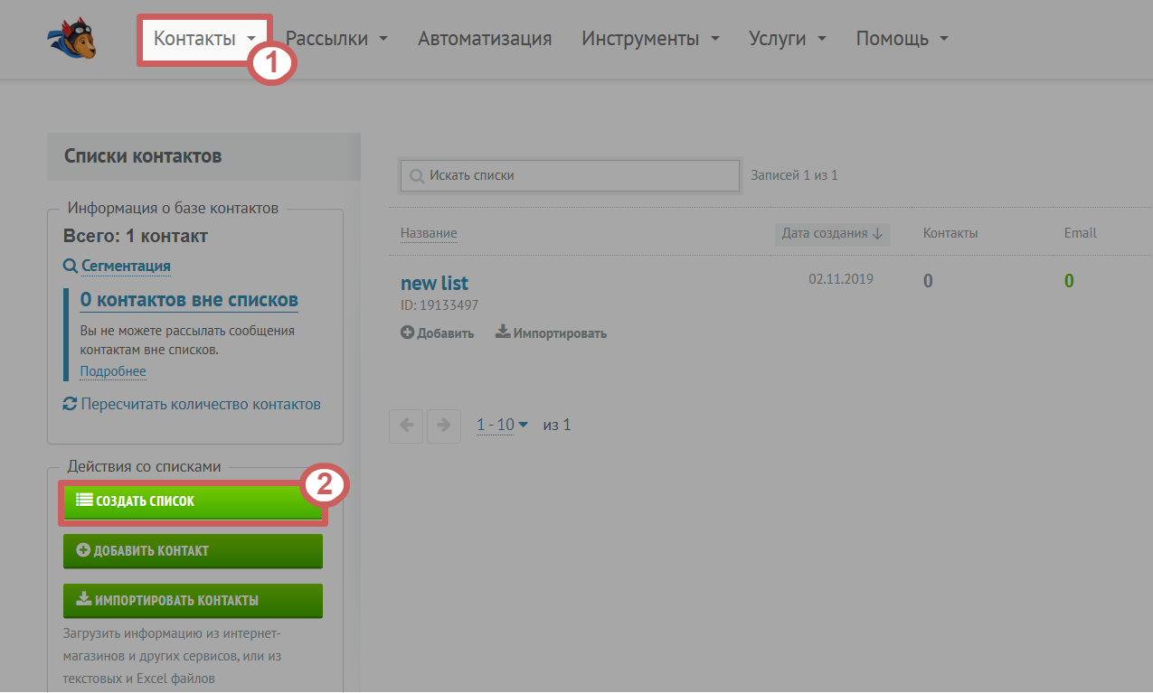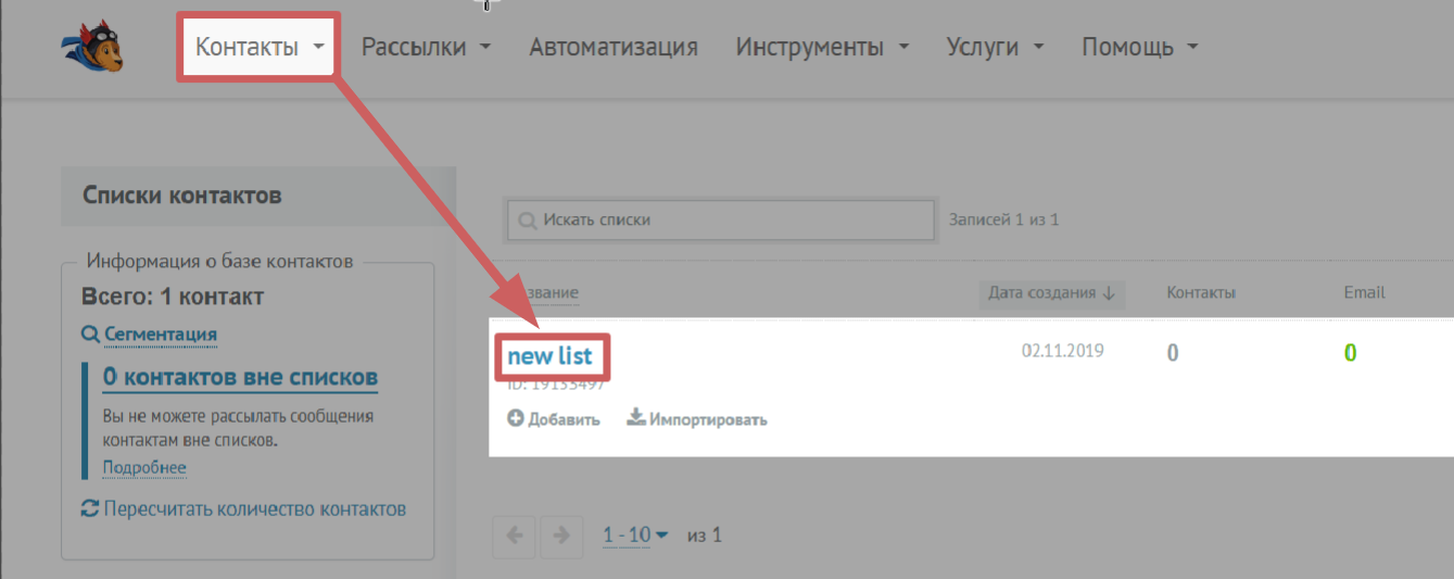 1. Список для добавления. Выбираем список, в который будем добавлять подписчиков, чтобы в дальнейшем произвести рассылку по адресам с этого списка. Изначально, у вас будет доступен только стандартный список, который создается при регистрации в UniSender. Если вы хотите создать новый список - зайдите в личный кабинет UniSender, в раздел «Контакты » и в подраздел «Список контактов »