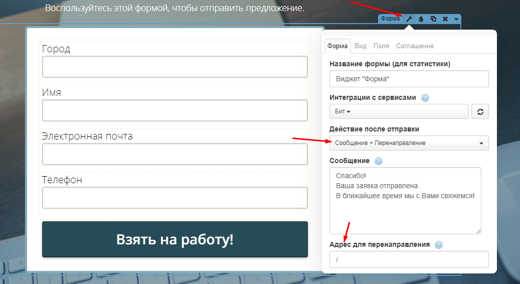 Способ 2. Используем форму заявки ("Действие после отправки" - "Перенаправление"):