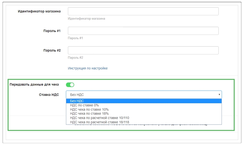 Чтобы выполнить эти условия - включаем функцию «Передавать данные для чека » и выбираем нужные параметры ставки НДС: