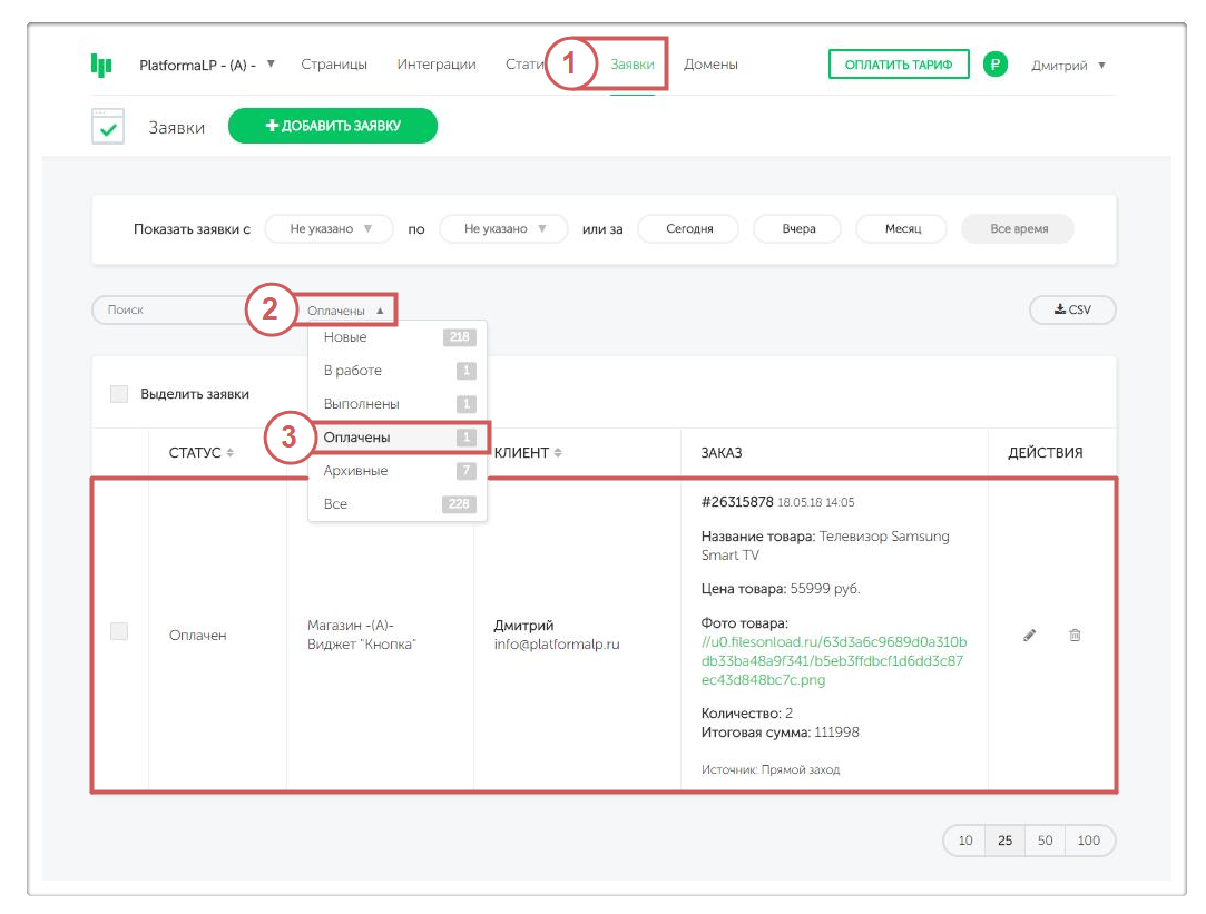 Если вы хотите посмотреть список только успешно оплаченных заявок - выберите в фильтре значение «Оплачены »