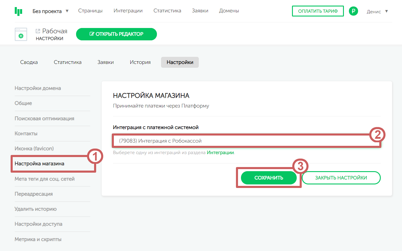 В разделе**** «Настройки магазина » выбираем созданную интеграцию с Робокассой и нажимаем на кнопку «Сохранить »