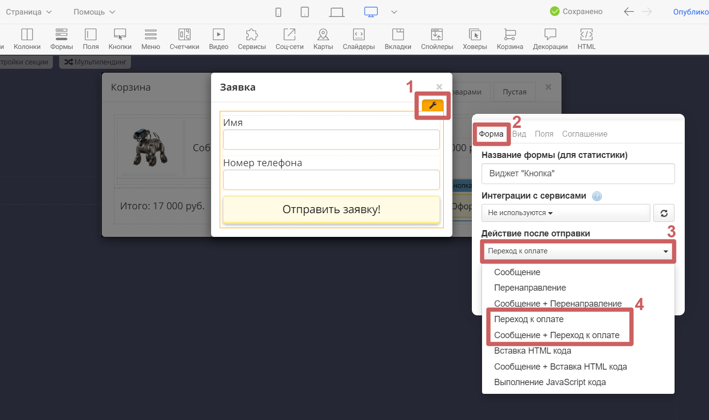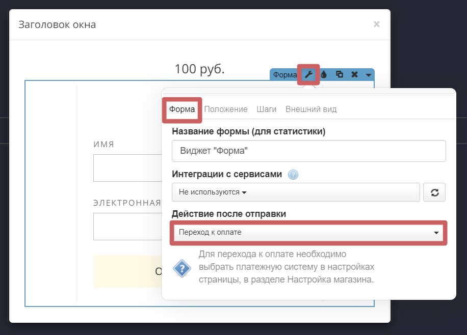 3. Заходим в настройки формы и выбираем действие после отправки формы - переход к оплате
