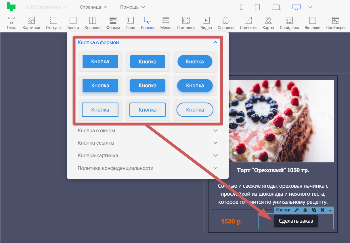 Шаг 1. Когда у вас уже есть блок карточки товара - добавьте внутрь блока виджет «Кнопка с формой »