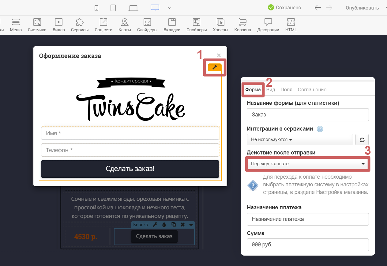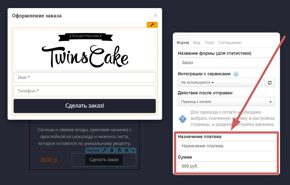 Шаг 3. Выполняем настройки перехода к оплате: