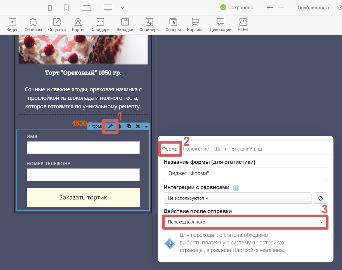 Шаг 4. Публикуем страницу. На опубликованной странице нужно попробовать отправить форму заявки и оплатить заказ, чтобы проверить, все ли работает.