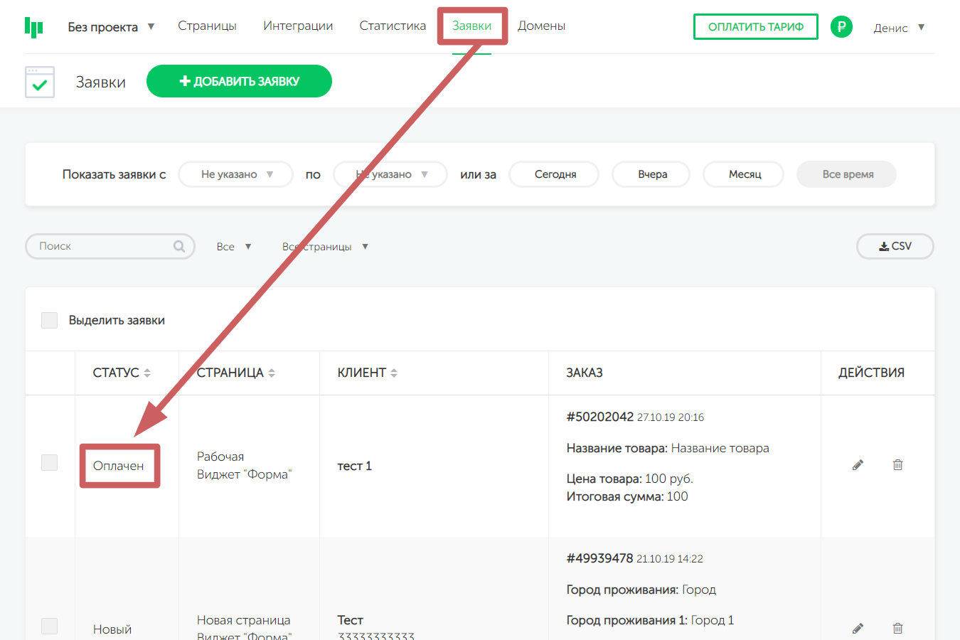 Помимо уведомлений, вы можете проверять оплаченные заявки в личном кабинете, в разделе «Заявки ». Статус успешно оплаченной заявки меняется с «Новый » на «Оплачен »