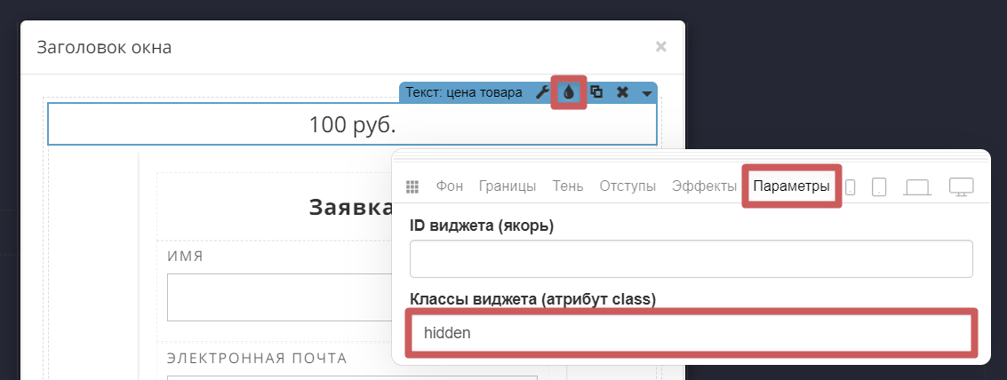 4. Если вы не хотите, чтобы цену товара было видно в модальном окне, то зайдите в настройки стилей виджета «Цена товара» (иконка капельки), в раздел «Параметры » и укажите в поле «Класс виджета » значение: