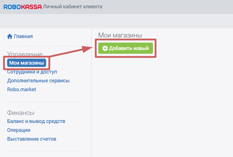 Шаг 3. После заполнения профиля в Робокассе, переходим к добавлению своего интернет-магазина. Для этого нажимаем на кнопку «Мои магазины » и на «Добавить новый »