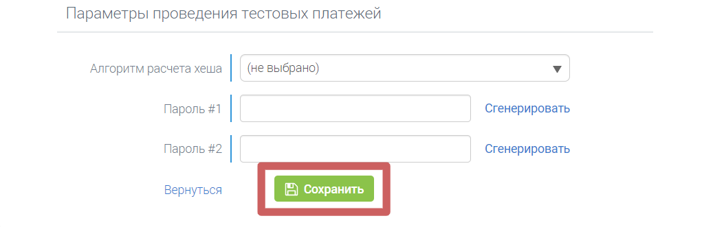 Шаг 6. Параметры проведения тестовых платежей не трогаем. Нажимаем на кнопку «Сохранить »
