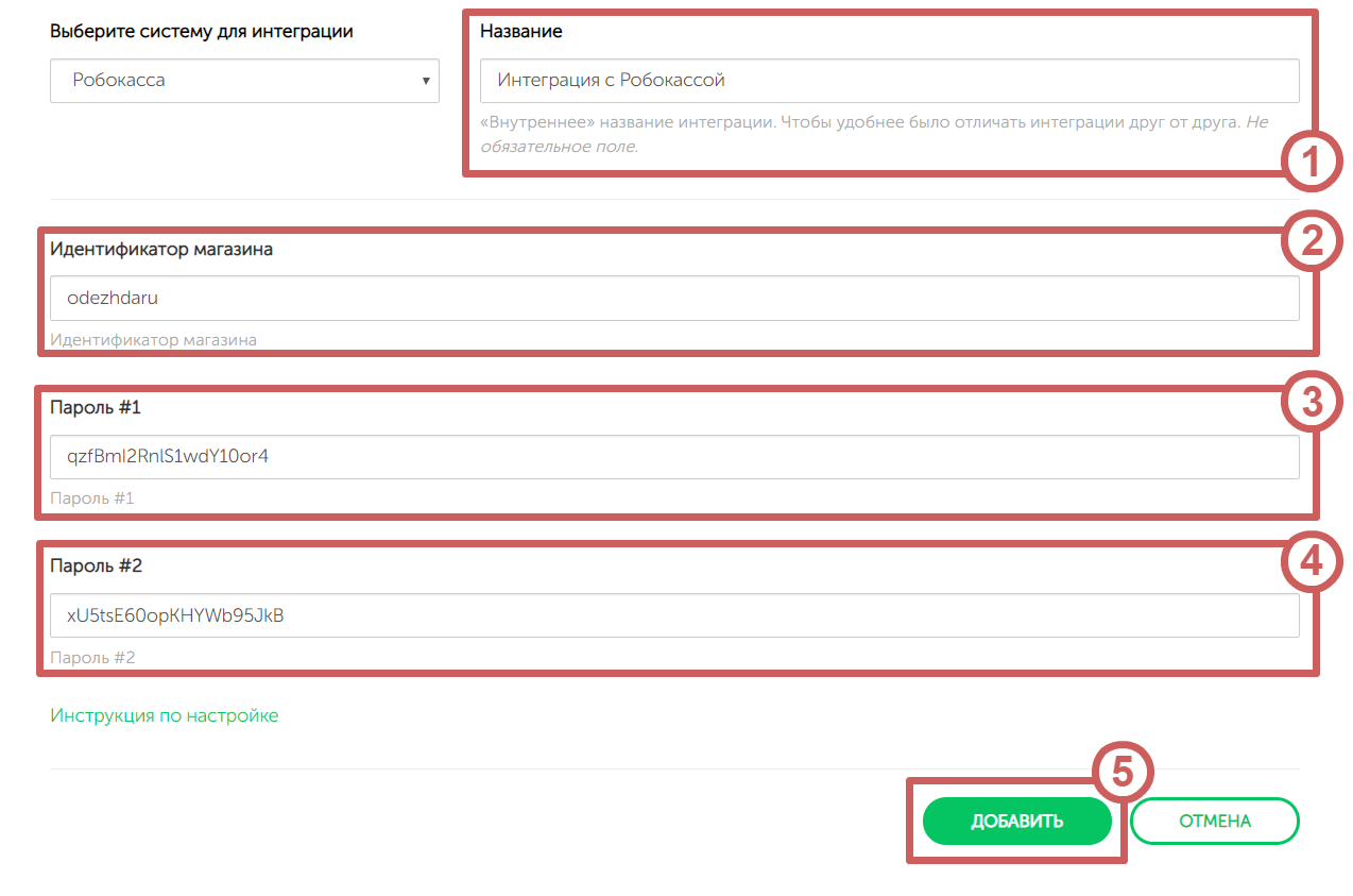 Шаг 3. После добавления интеграции с Робокассой, перейдем к настройкам интеграции. По порядку заполните поля: