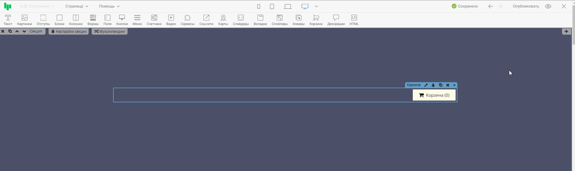 Шаг 3. Публикуем страницу. На опубликованной странице нужно попробовать добавить товар в корзину, отправить форму заявки и оплатить заказ, чтобы проверить, все ли работает.