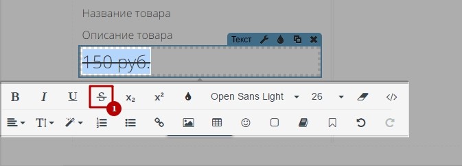 Установить две цены на одну карточку товара можно с помощью двух виджетов “Текста”: на старой цене установим роль “Текст” и перечеркнем её, а на новой цене оставим роль “Цена товара”.