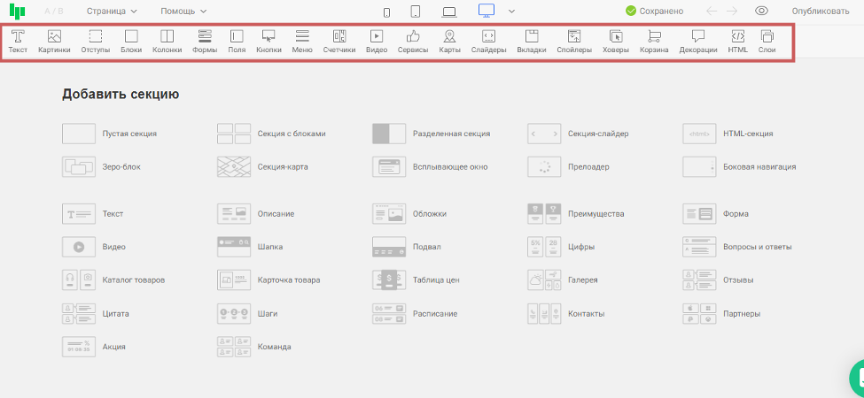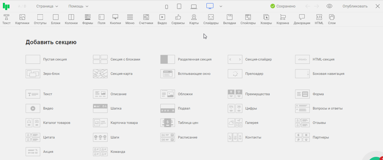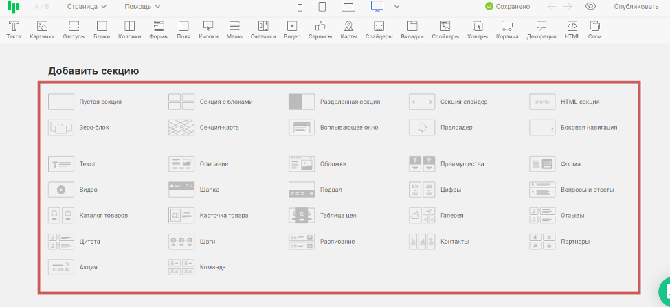 Для быстрого поиска готовые секции разделены на категории: первый экран, шапка, подвал, список товаров, галерея, видео, отзывы и другие.