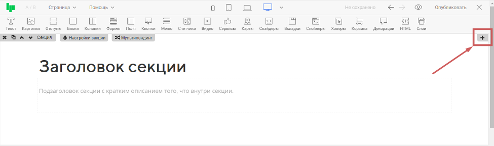 Если хотите добавить новую секцию между двумя имеющимися - нажмите на иконку ✚**** между секциями: