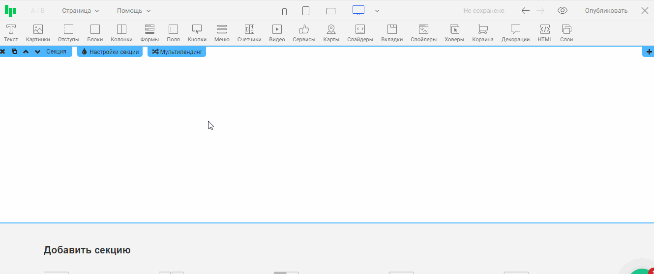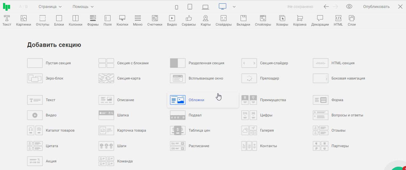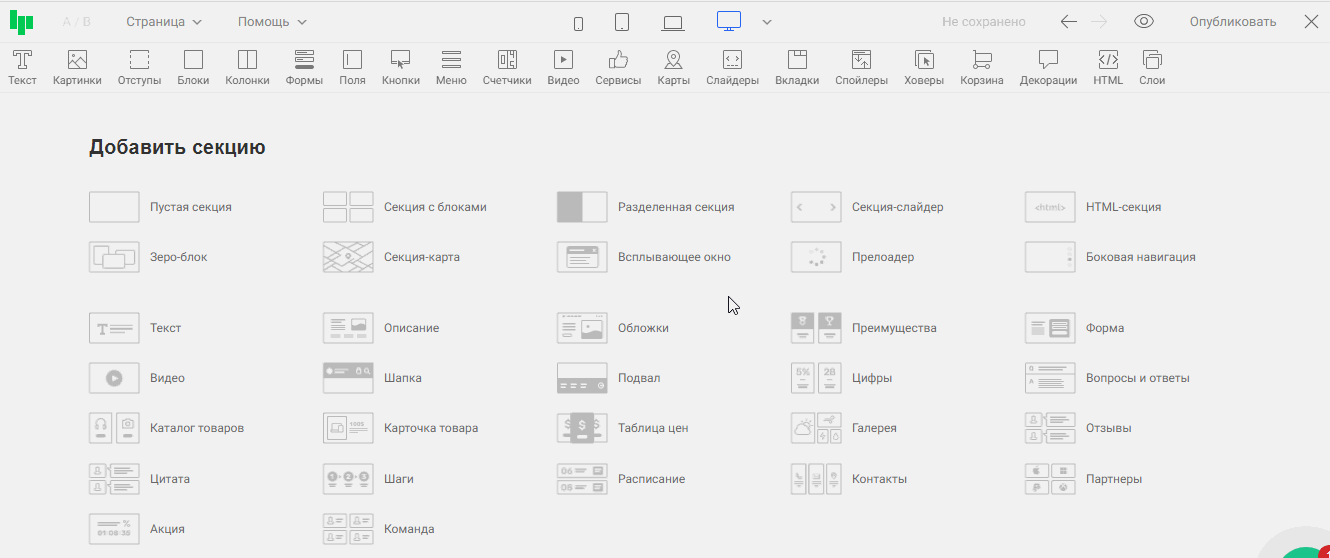 Готовые секции находятся в нижней части редактора: